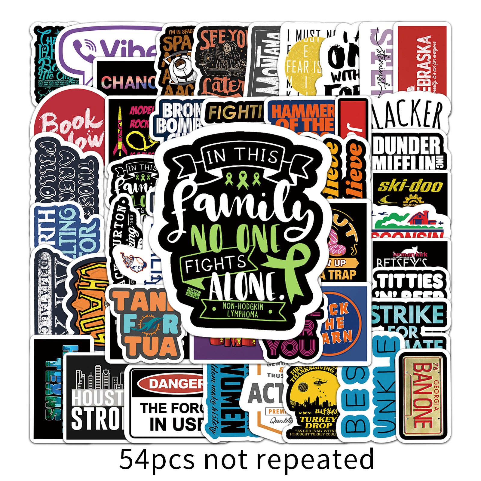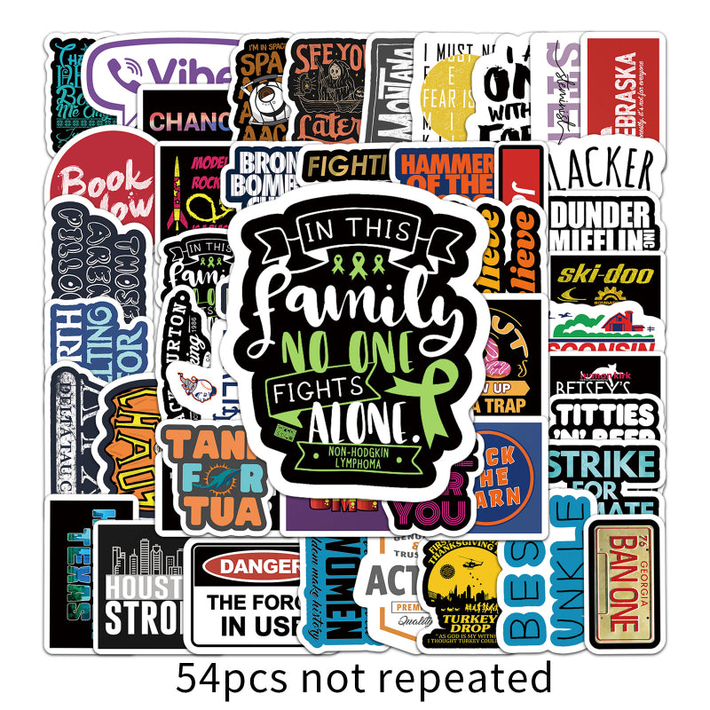 This set of 54 cartoon graffiti letter stickers is made from high-quality waterproof PVC material. Featuring a variety of vibrant designs, they're perfect for personalizing your luggage, laptop, skateboard, car, and more. Whether you're into DIY projects or just want to add a unique touch to your belongings, these stickers let your creativity shine.