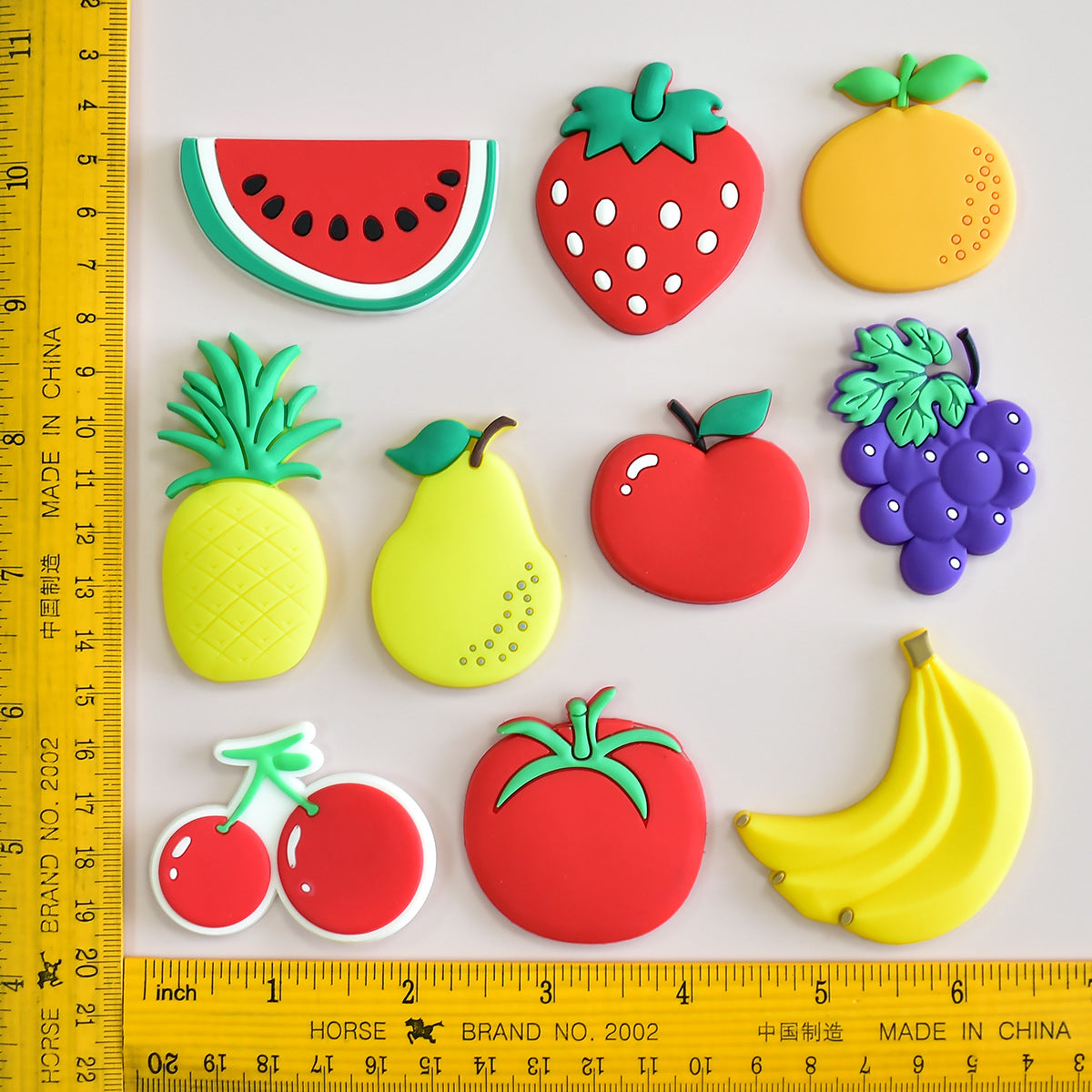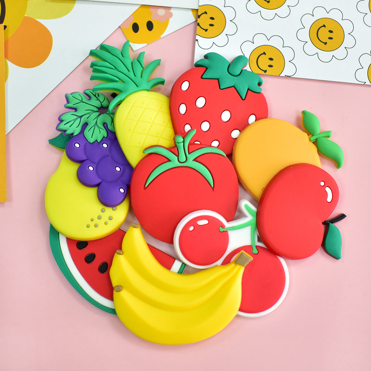 These adorable fruit cartoon fridge magnets are made from eco-friendly PVC soft rubber, offering a soft touch and vibrant colors. Designed with strong magnets, they securely attach to refrigerators, whiteboards, and other metal surfaces. Perfect for early childhood education, they help children recognize fruits, develop cognitive skills, and enhance learning interest. An ideal choice for home education and kindergarten teaching.